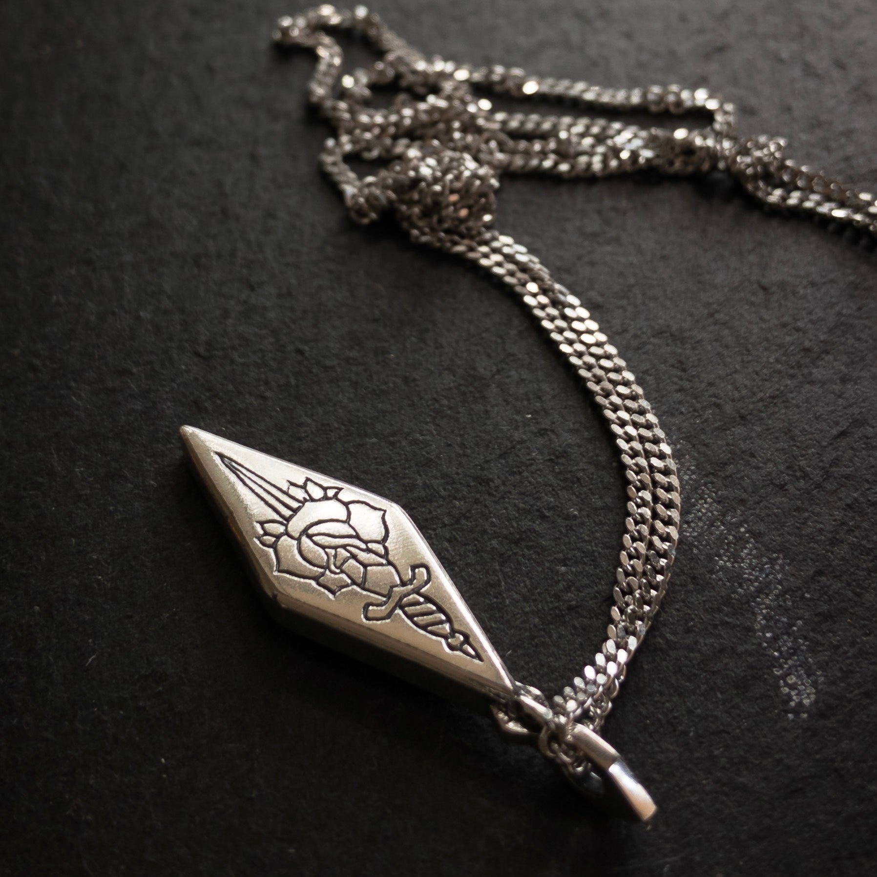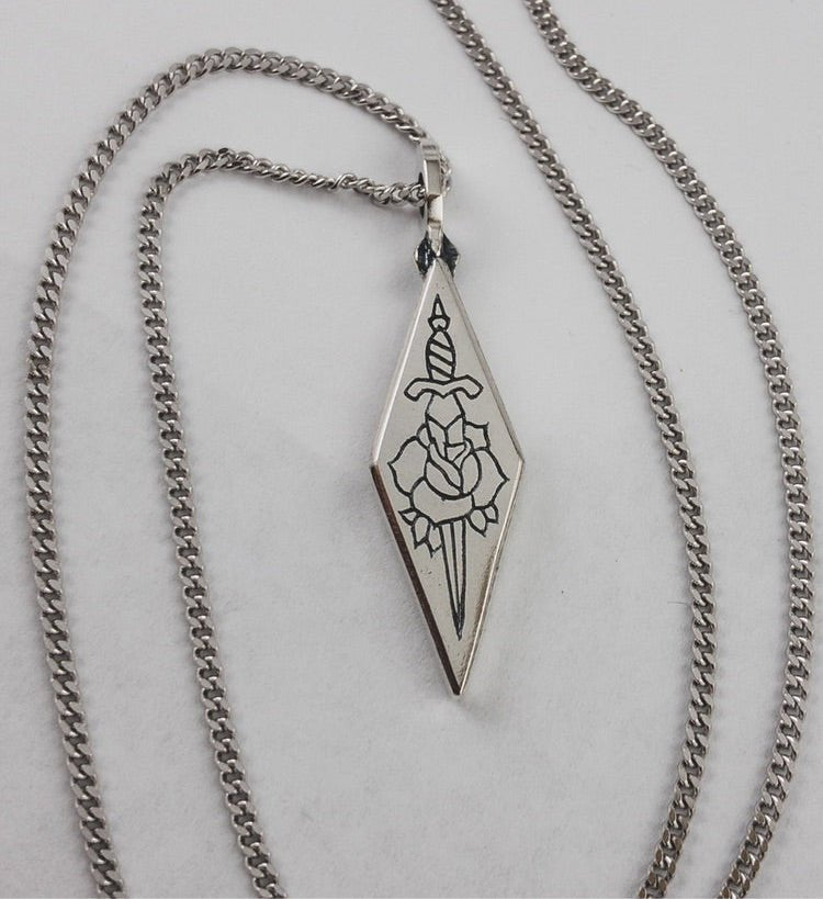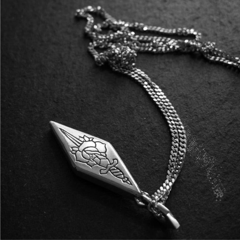 Hand carved and engraved sterling silver pendant with oxidised, tumble and hand polish finish.
