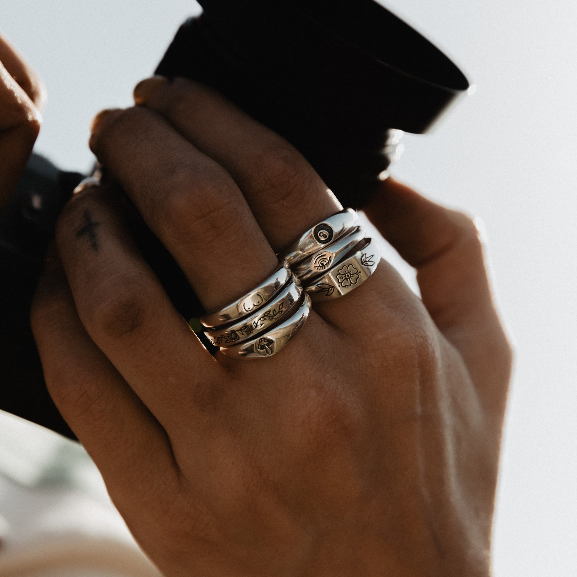 Stacker design the ring is hand carved by us in wax and created using the "lost wax method" in sterling silver ring with oxidised, tumble and hand polish finish.