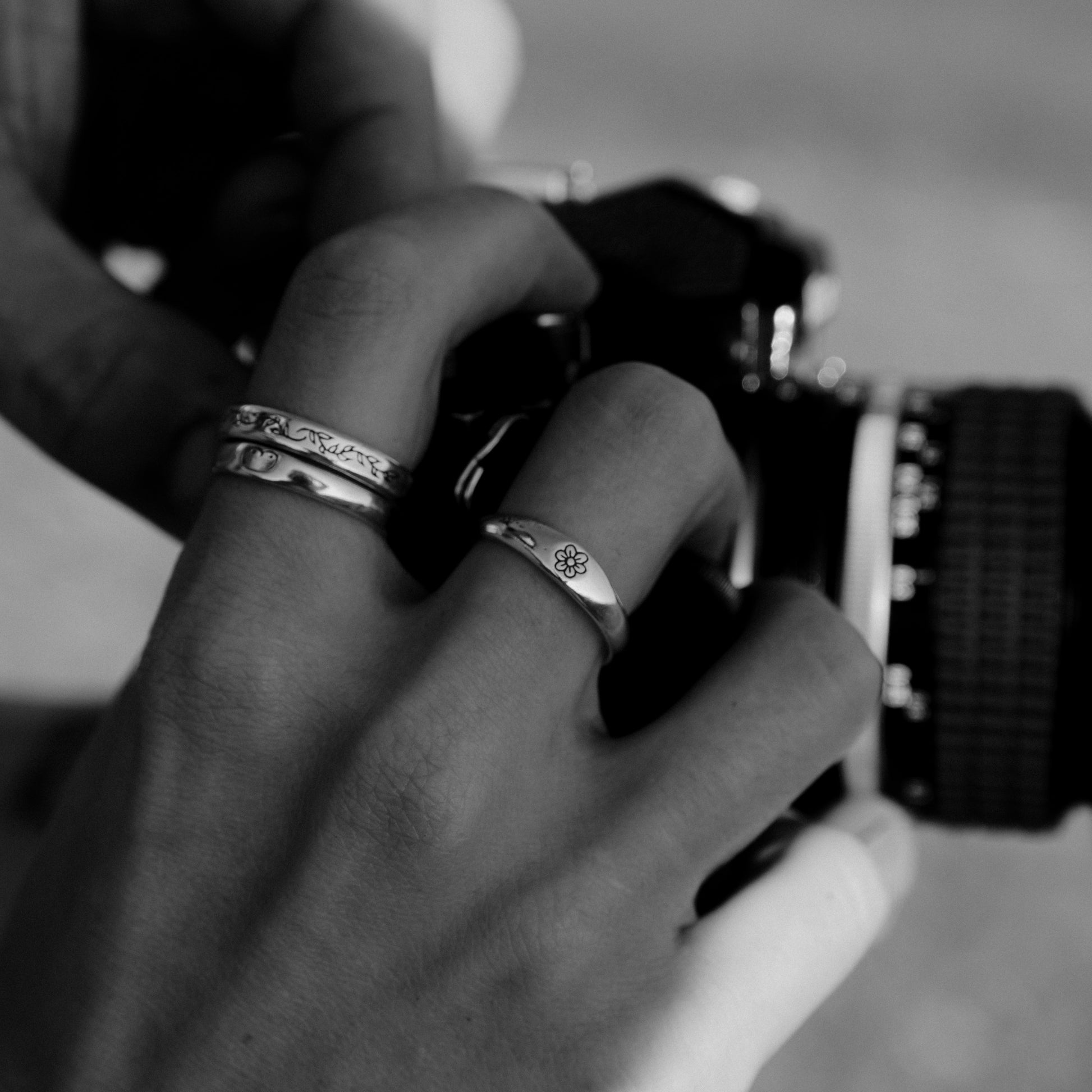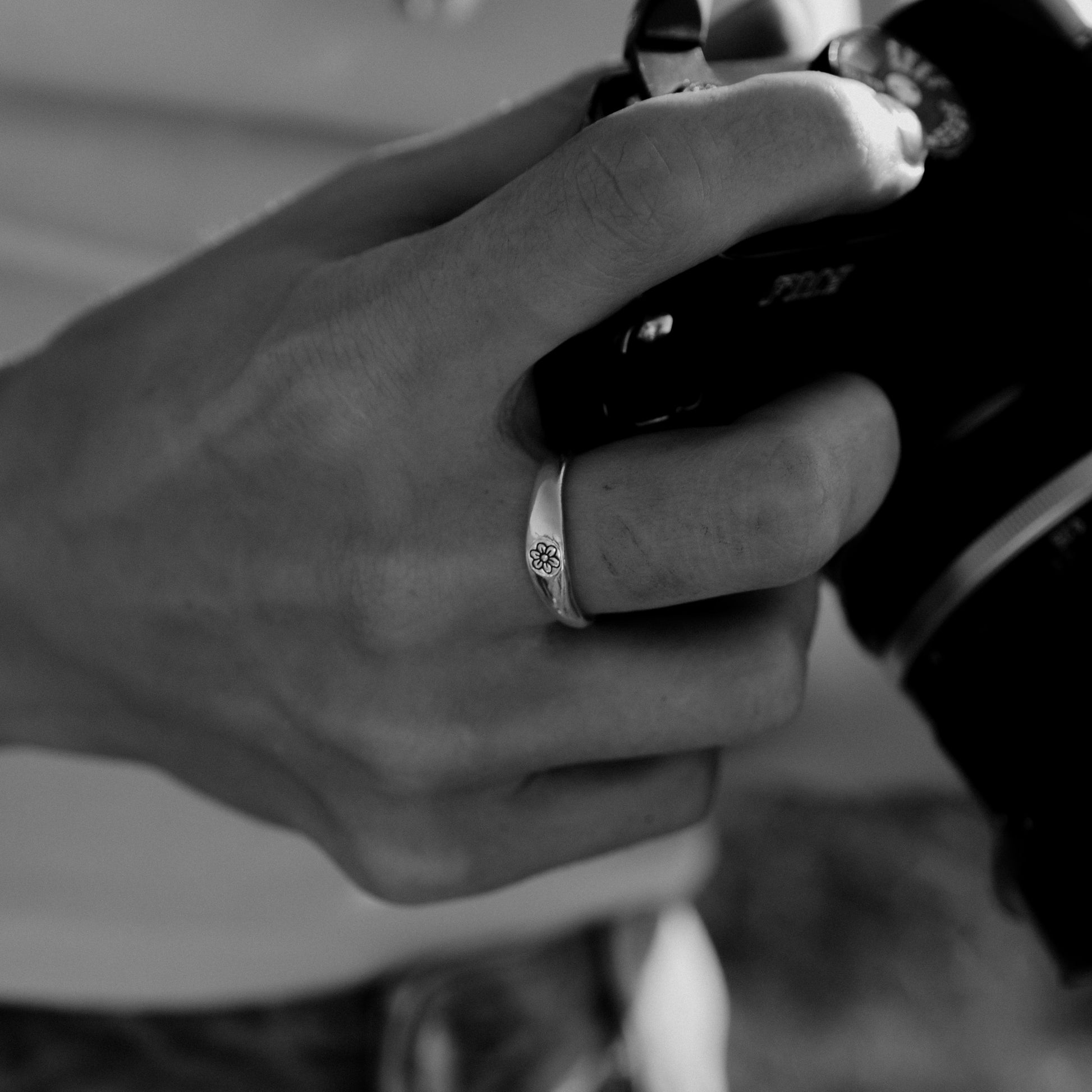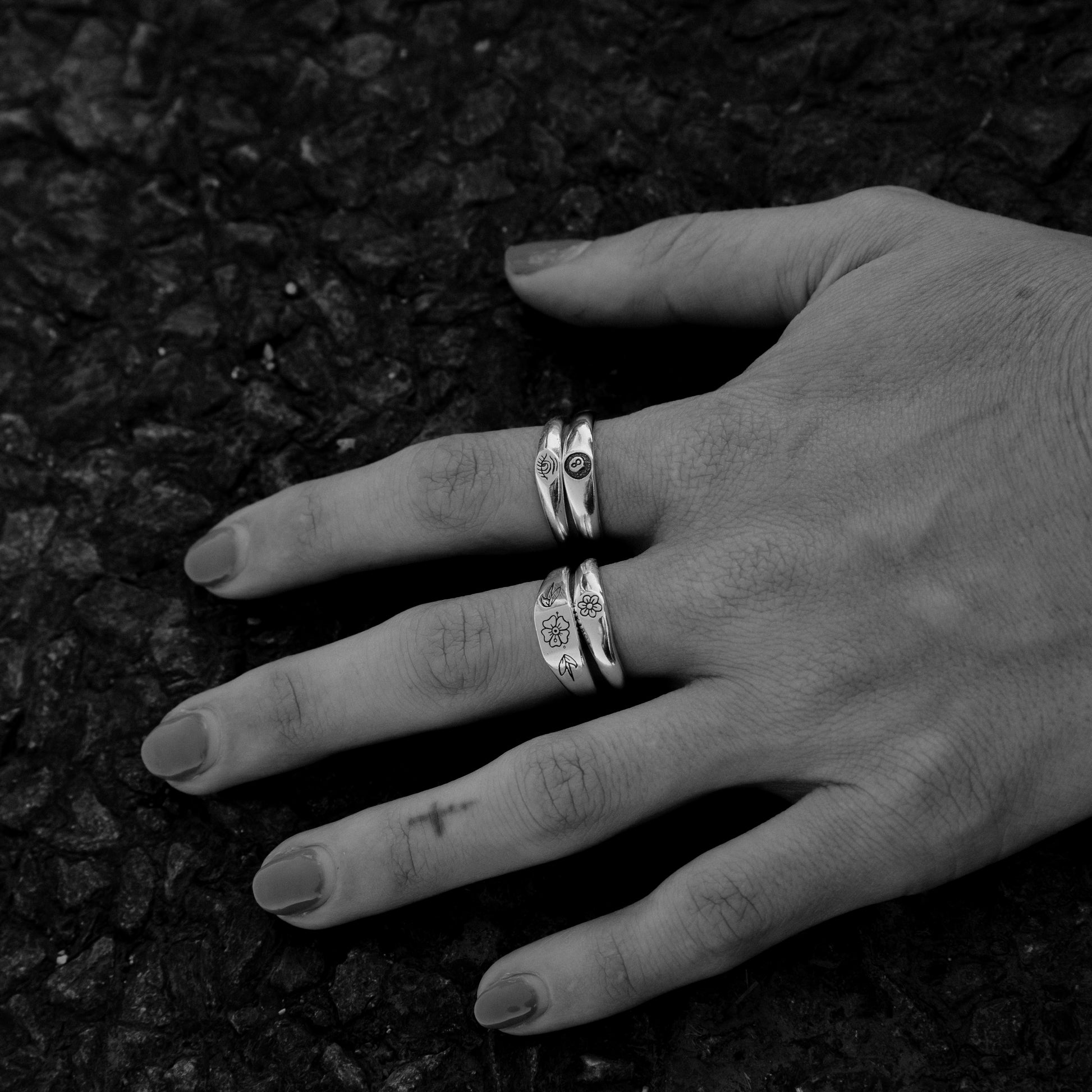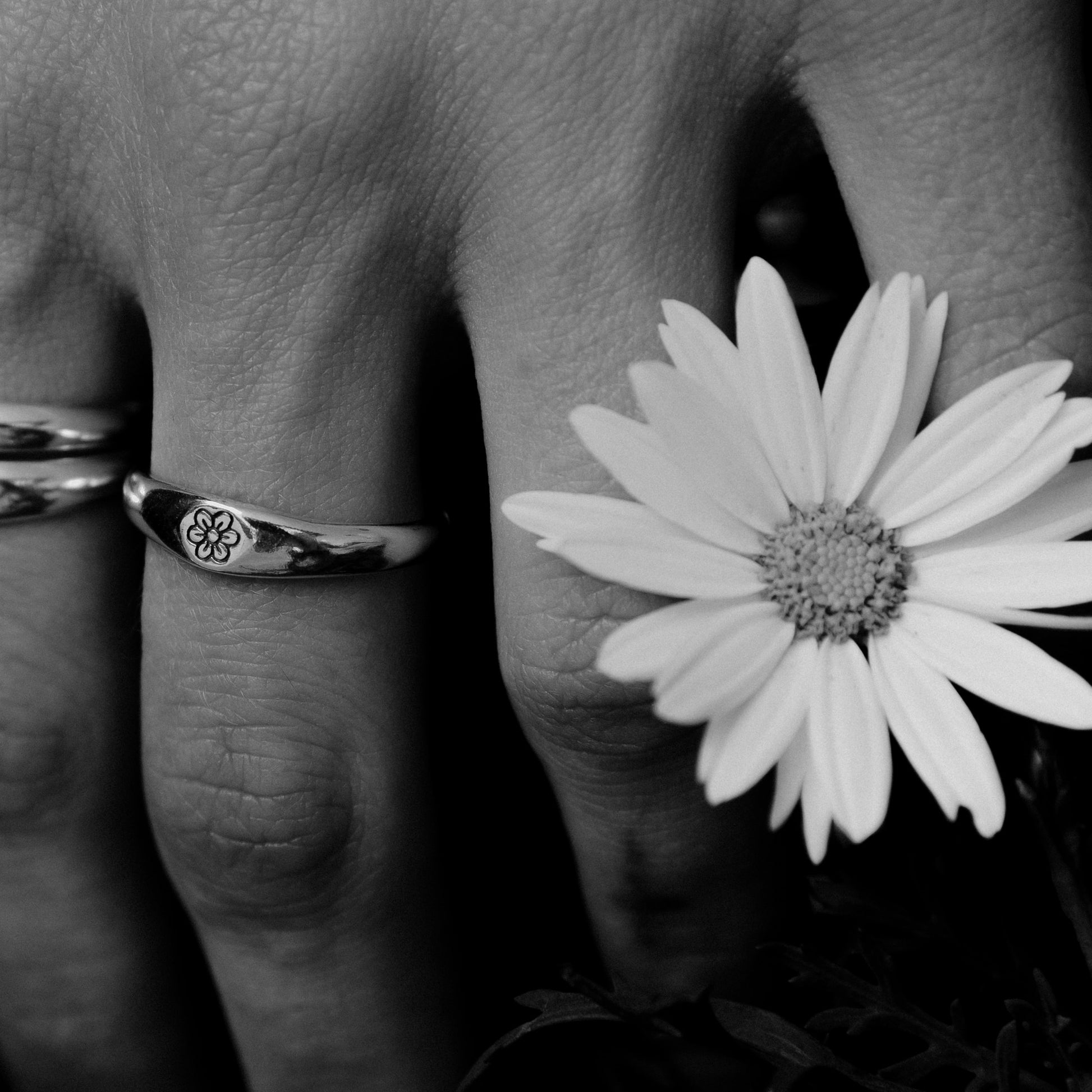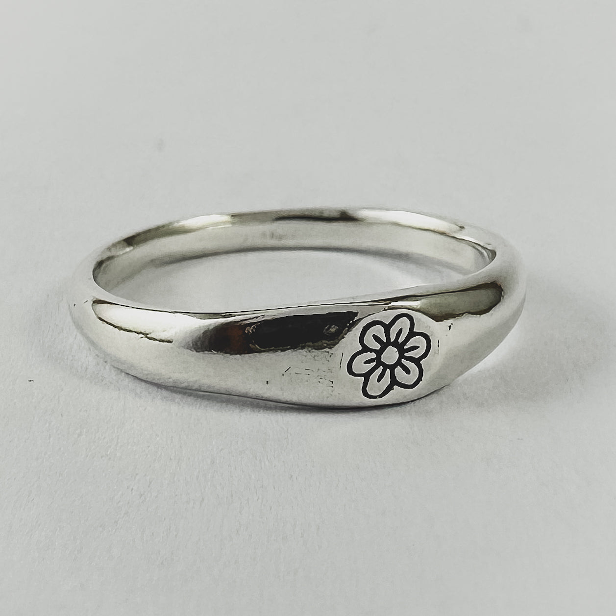 Inspired by Stick N' Poke tattoo designs the Flower stacker ring is hand carved by us in wax and created using the "lost wax method" in sterling silver ring with an oxidised, tumble and hand polish finish.