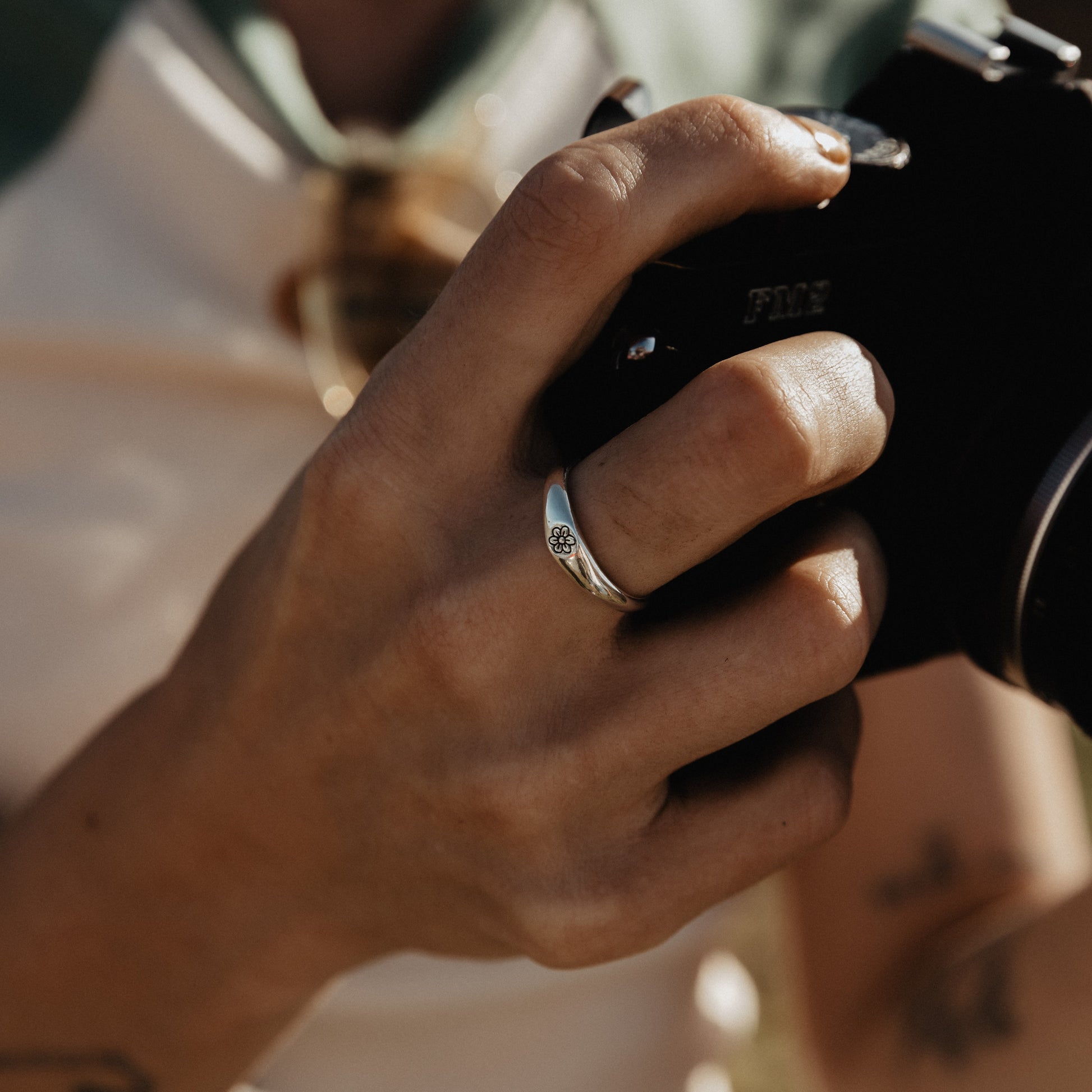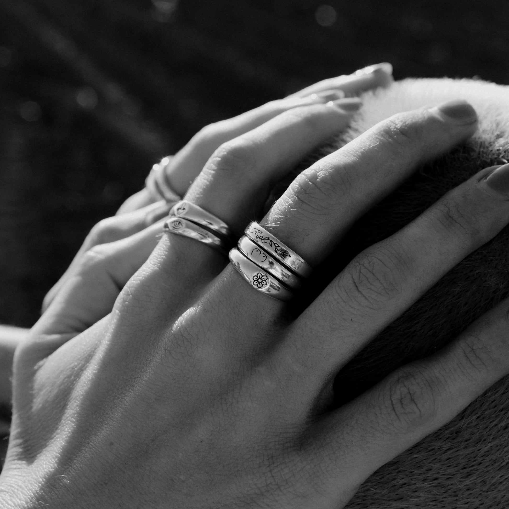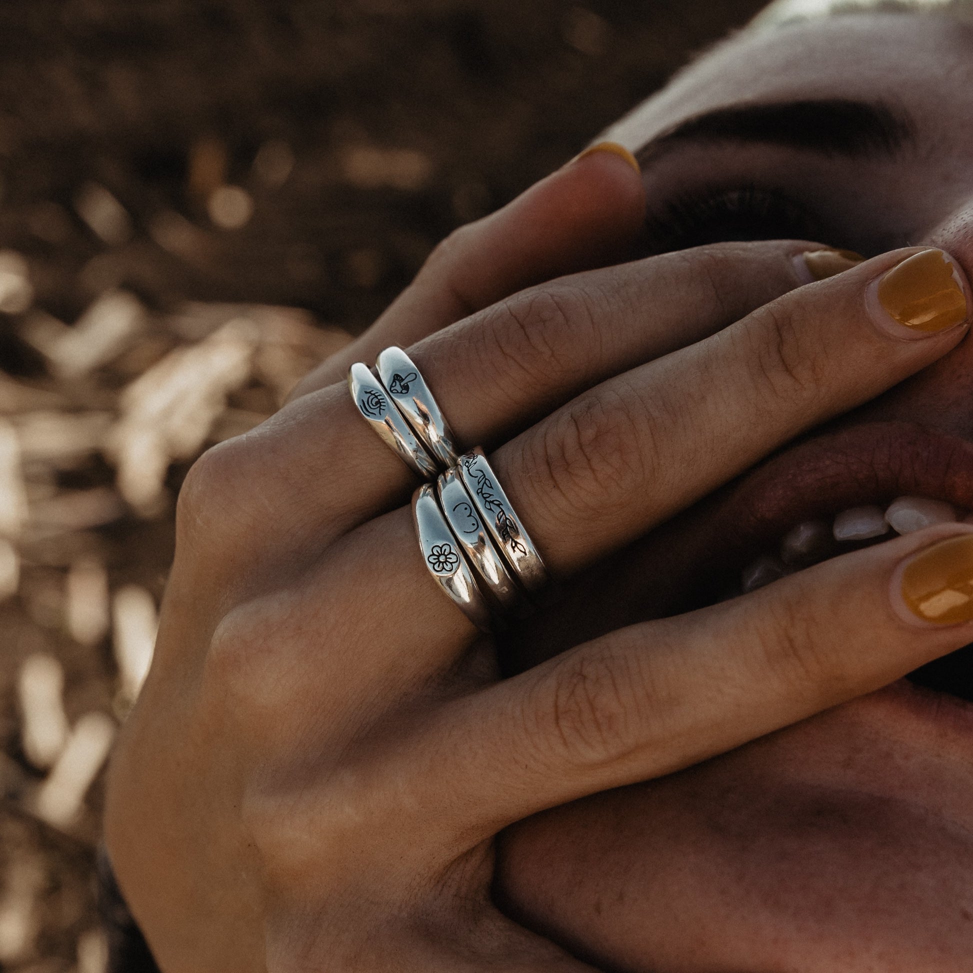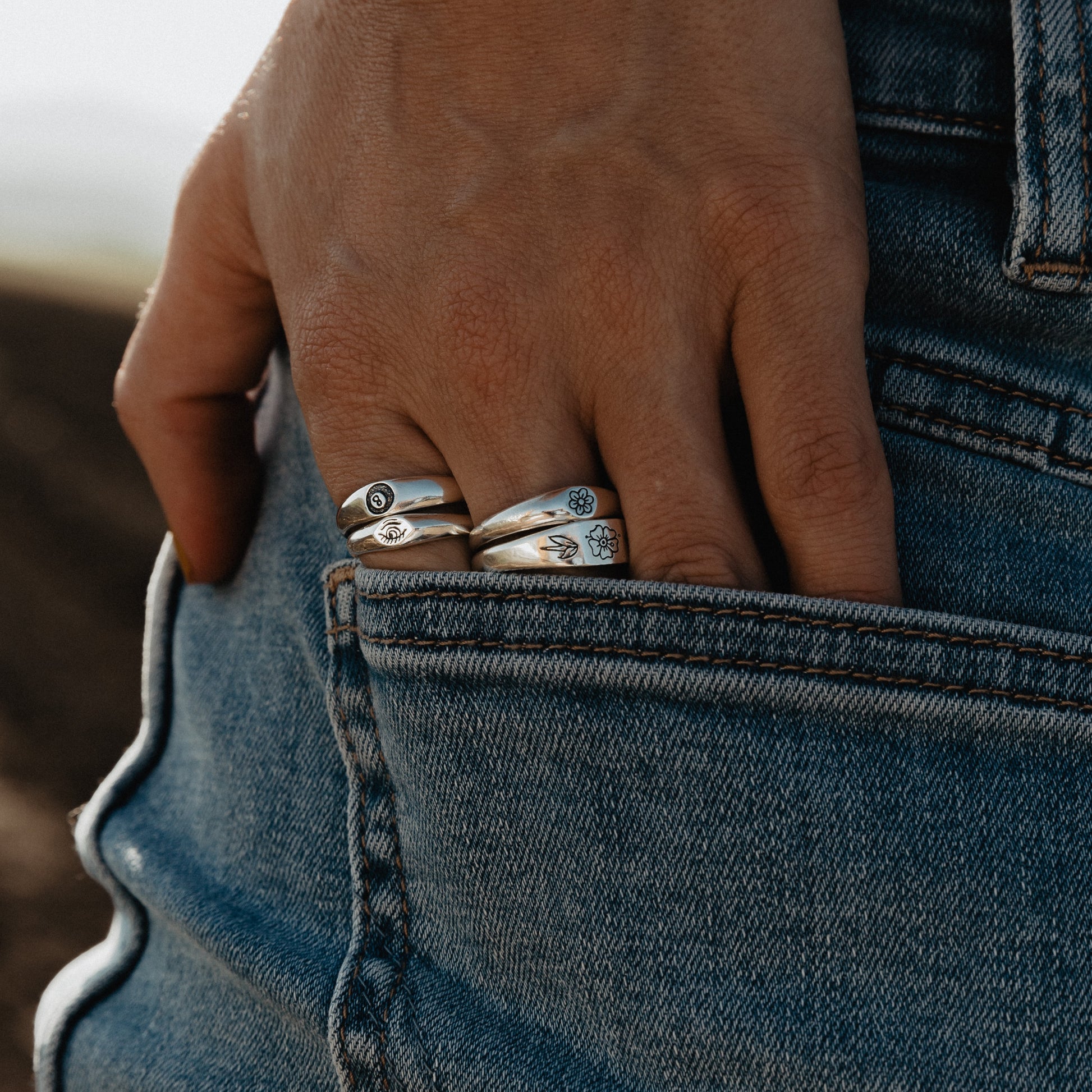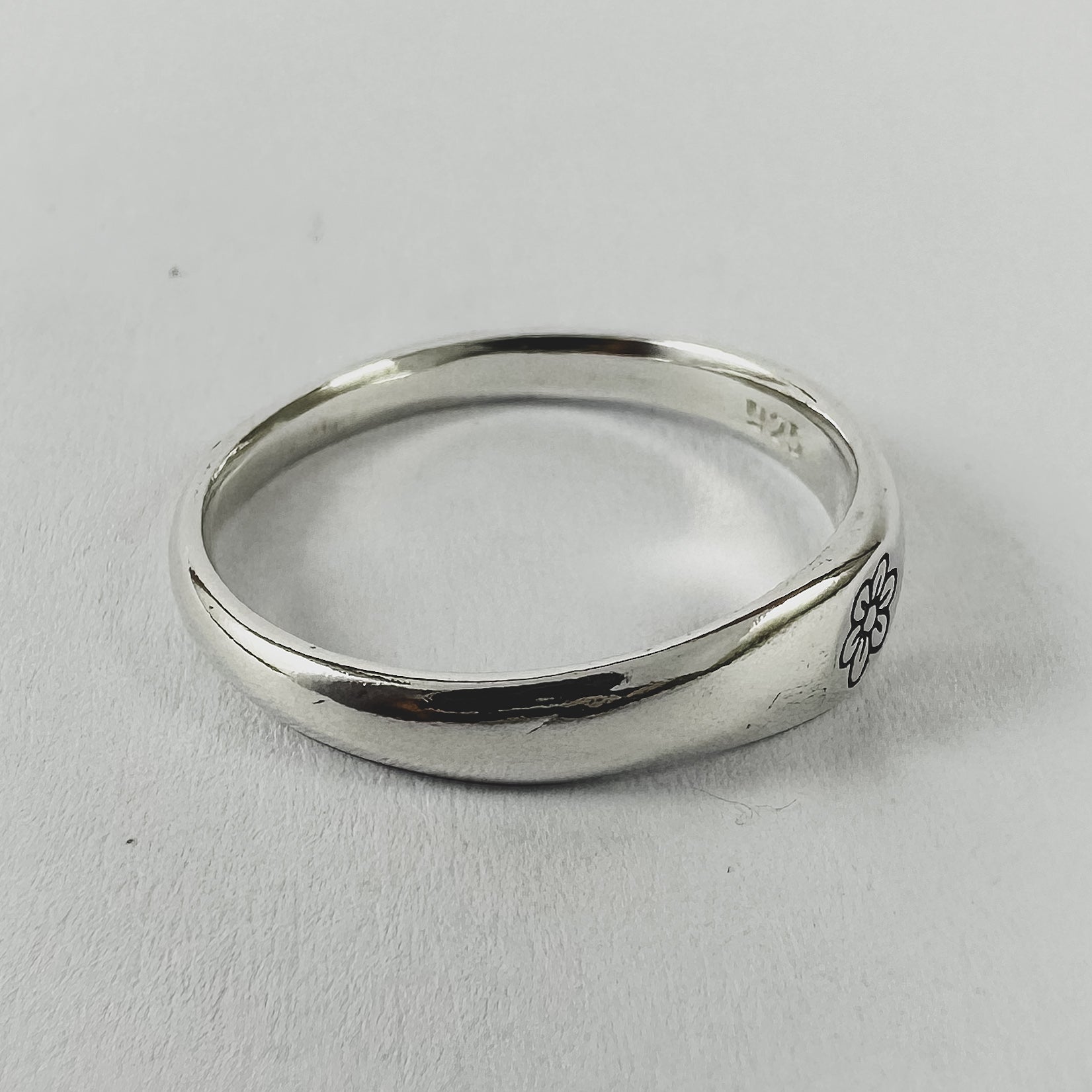 Inspired by Stick N' Poke tattoo designs the Flower stacker ring is hand carved by us in wax and created using the "lost wax method" in sterling silver ring with an oxidised, tumble and hand polish finish.