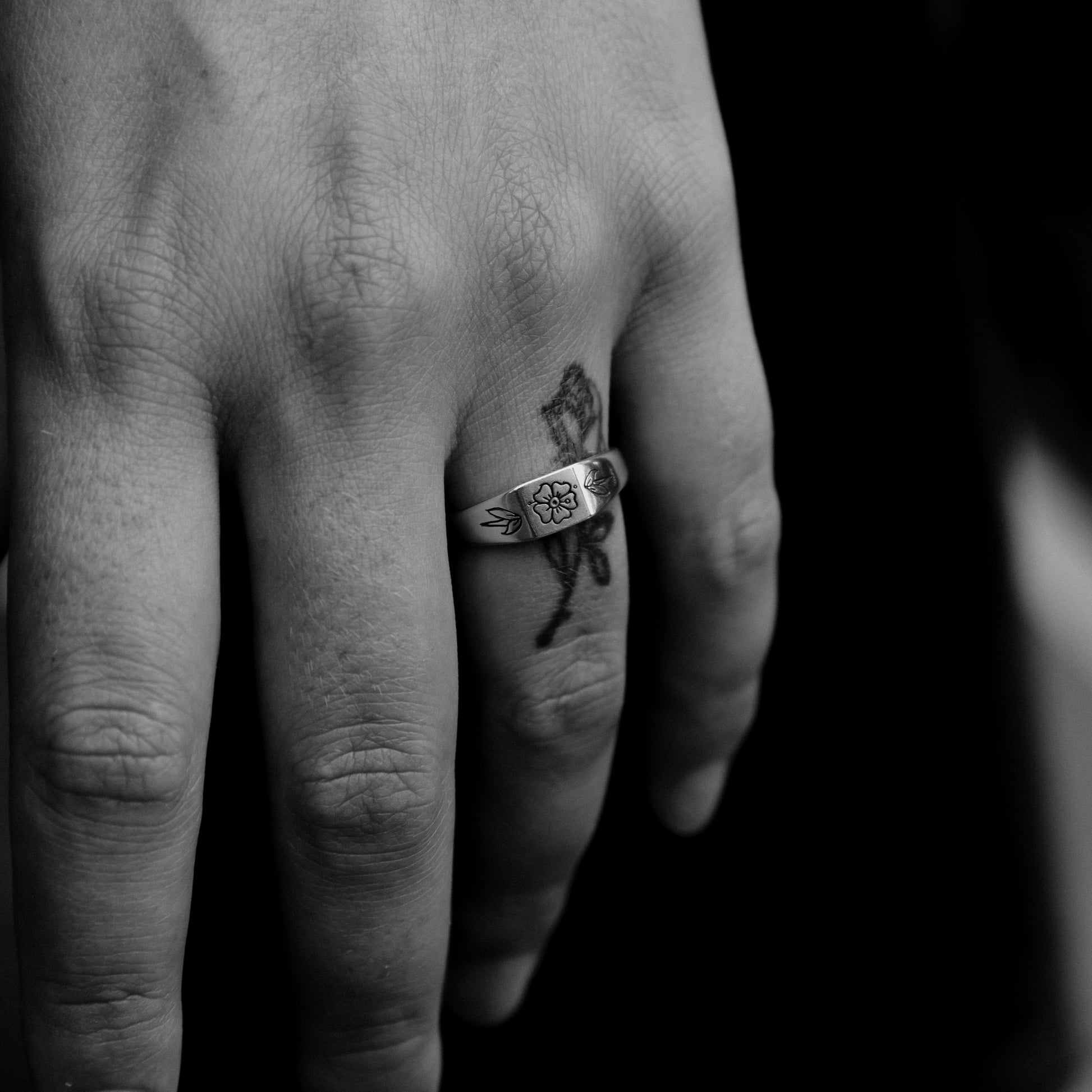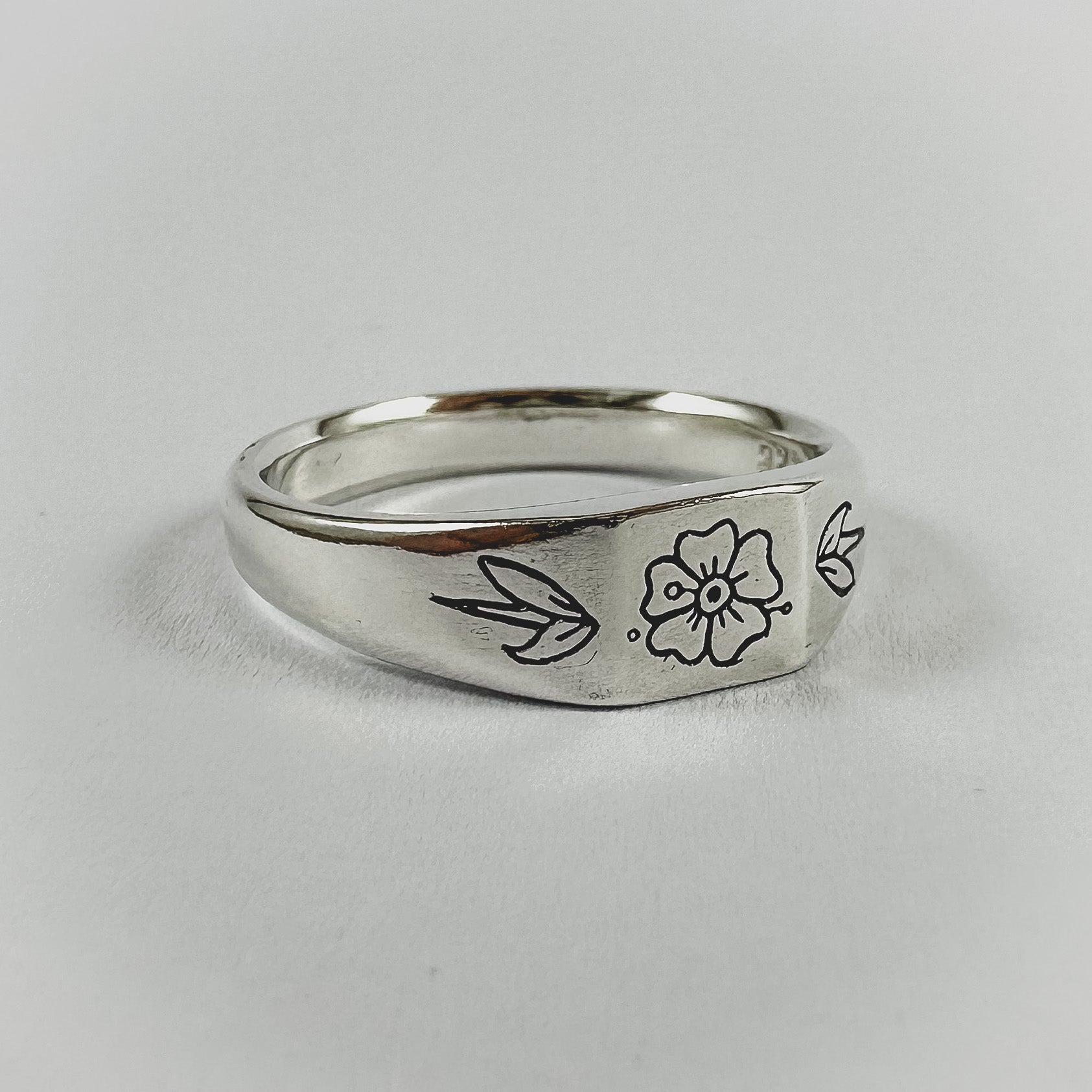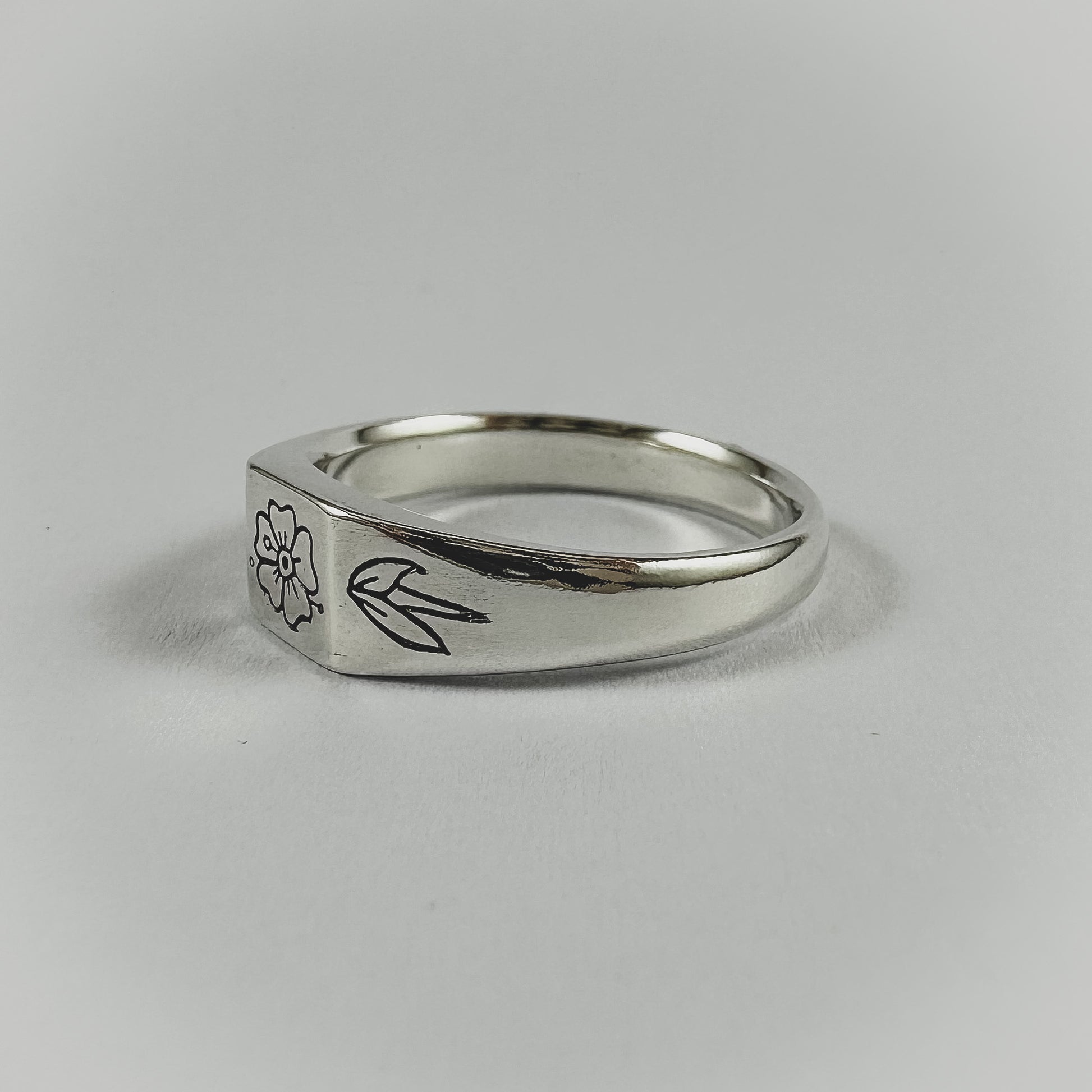 A small square signet design featuring a trad influenced flower on the face, a leaf down either side and "Forever" engraved sitting just above the finger when worn.