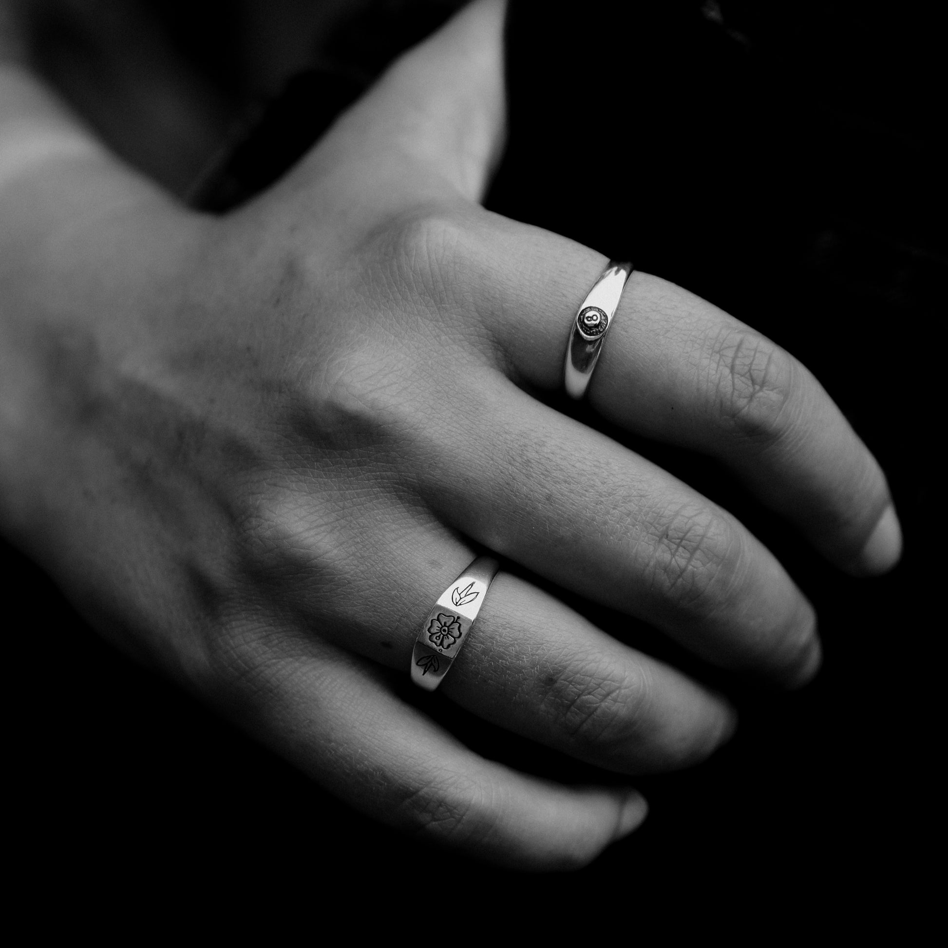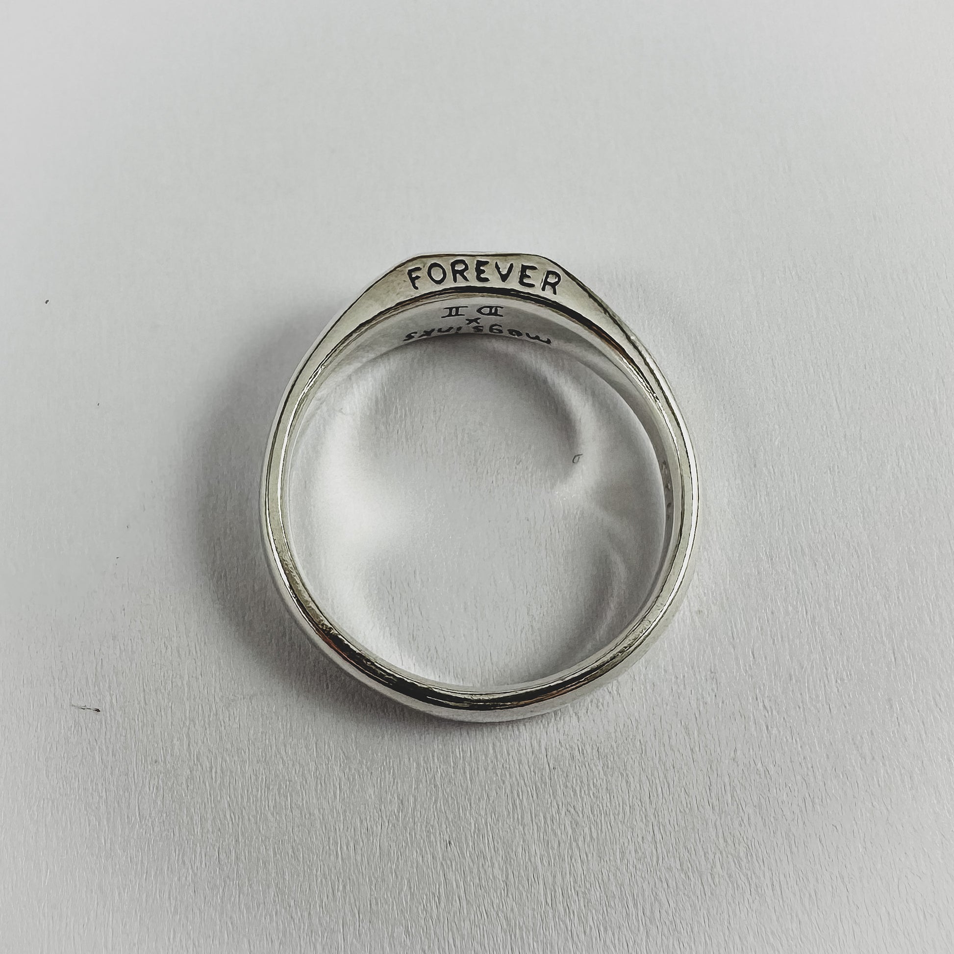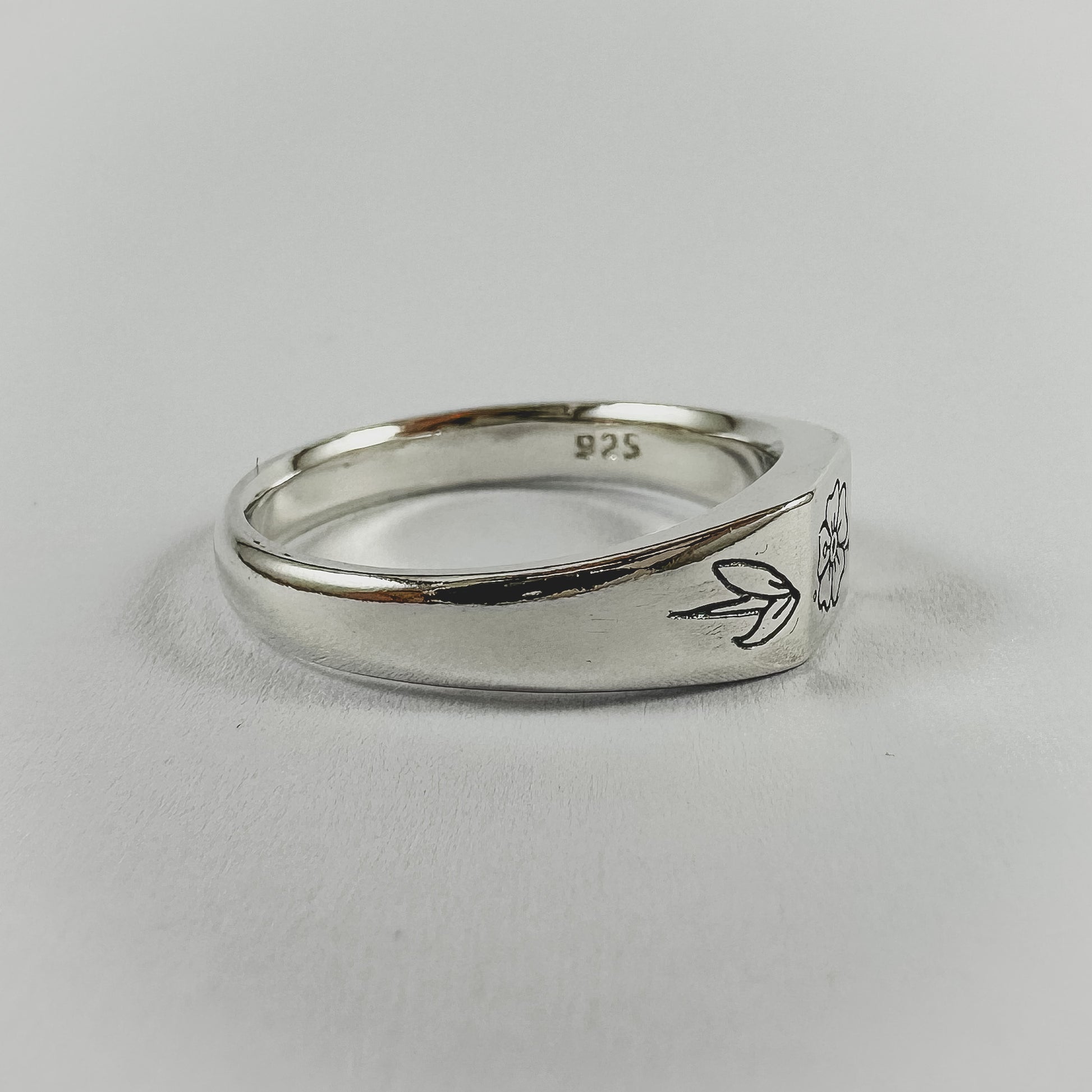 A small square signet design featuring a trad influenced flower on the face, a leaf down either side and "Forever" engraved sitting just above the finger when worn.