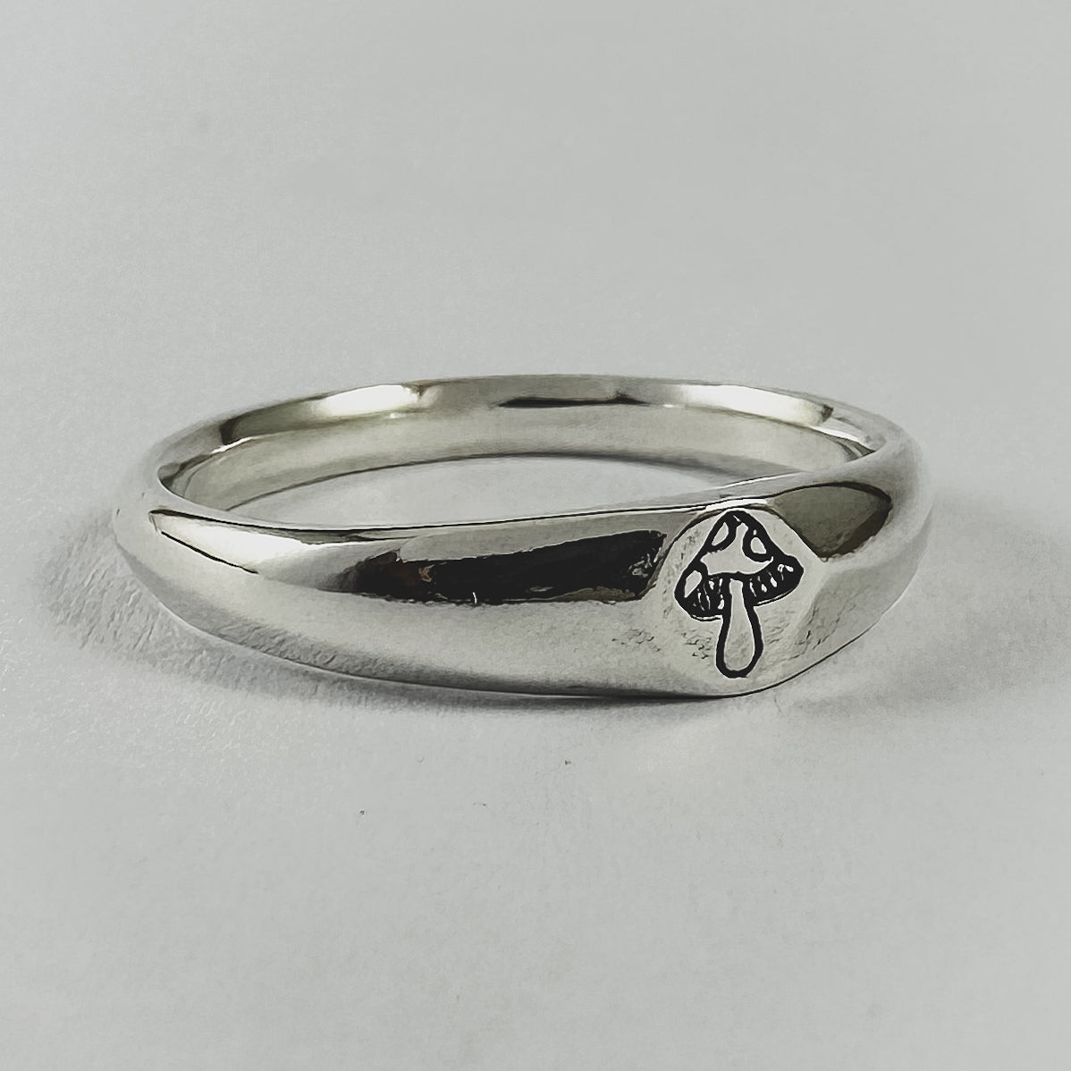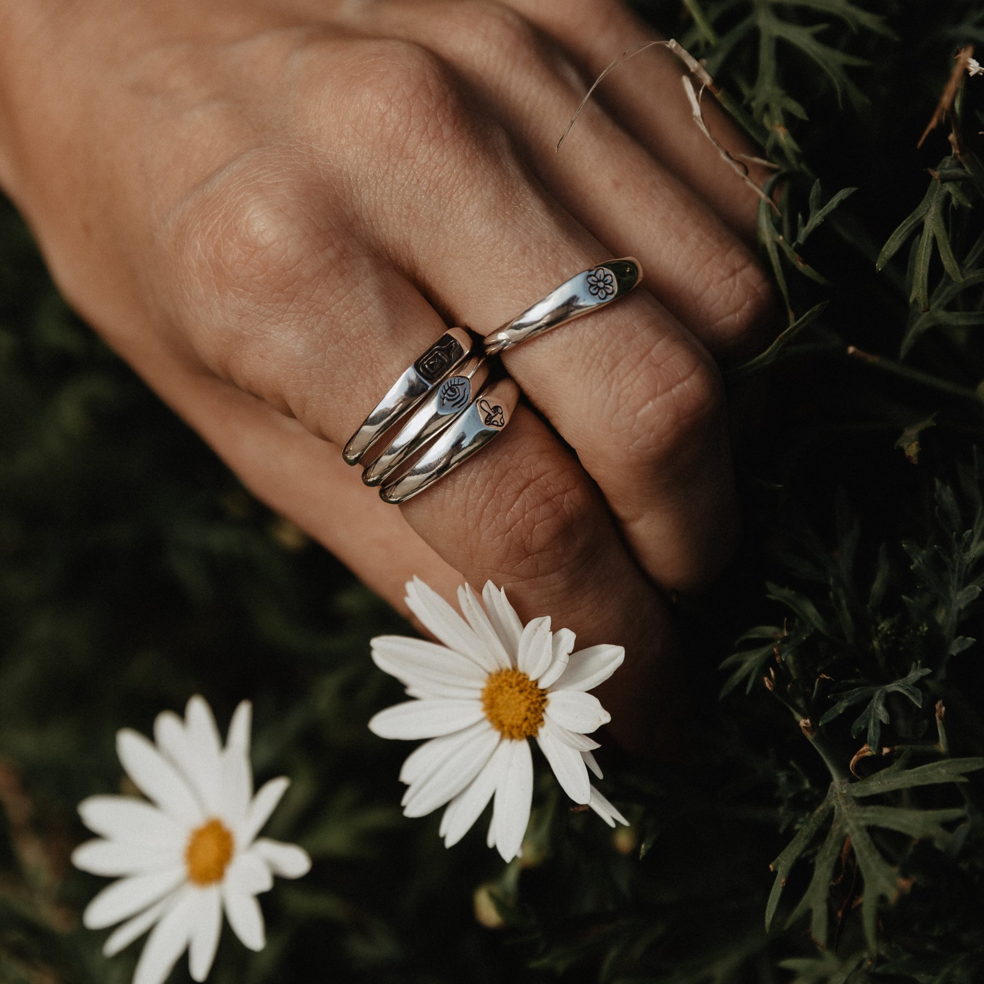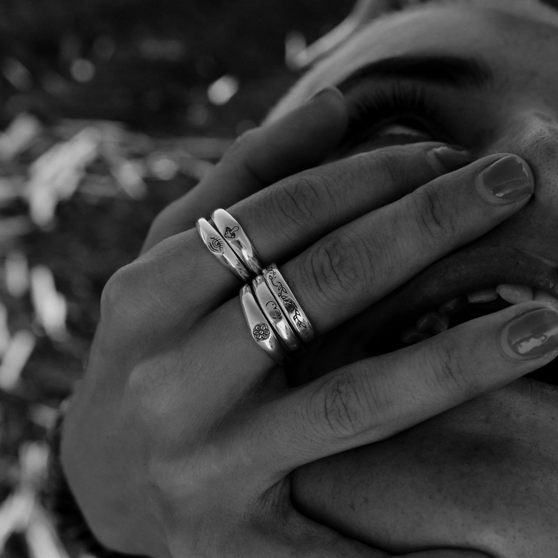 Inspired by Stick N' Poke tattoo designs the Mushy stacker ring is hand carved by us in wax and created using the "lost wax method" in sterling silver ring with oxidised, tumble and hand polish finish.