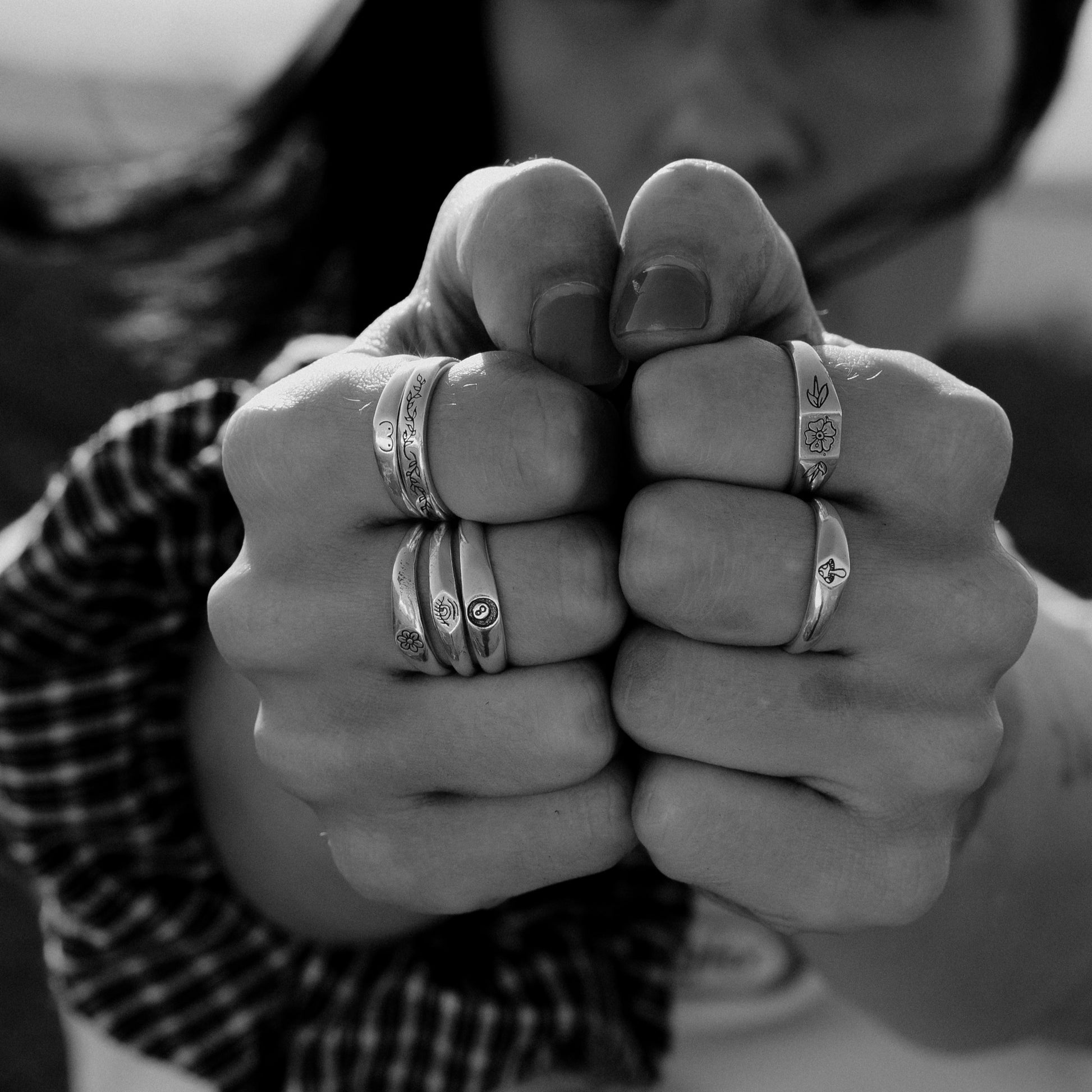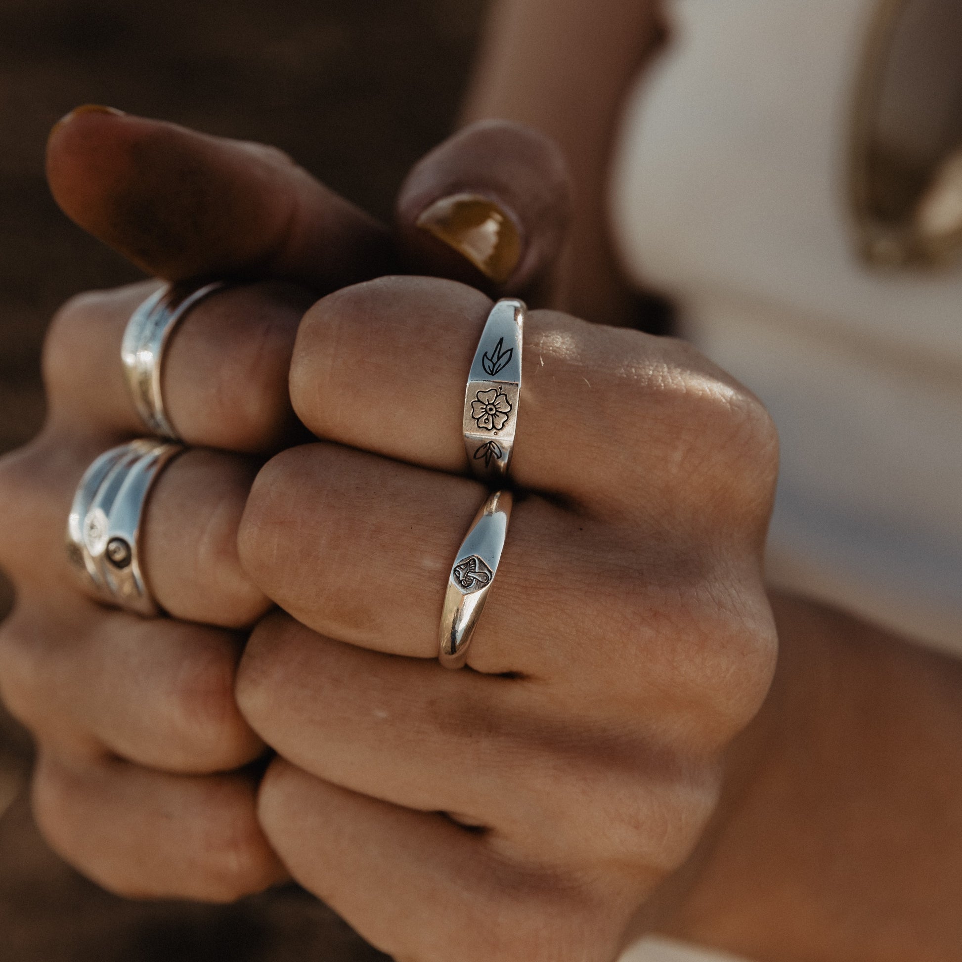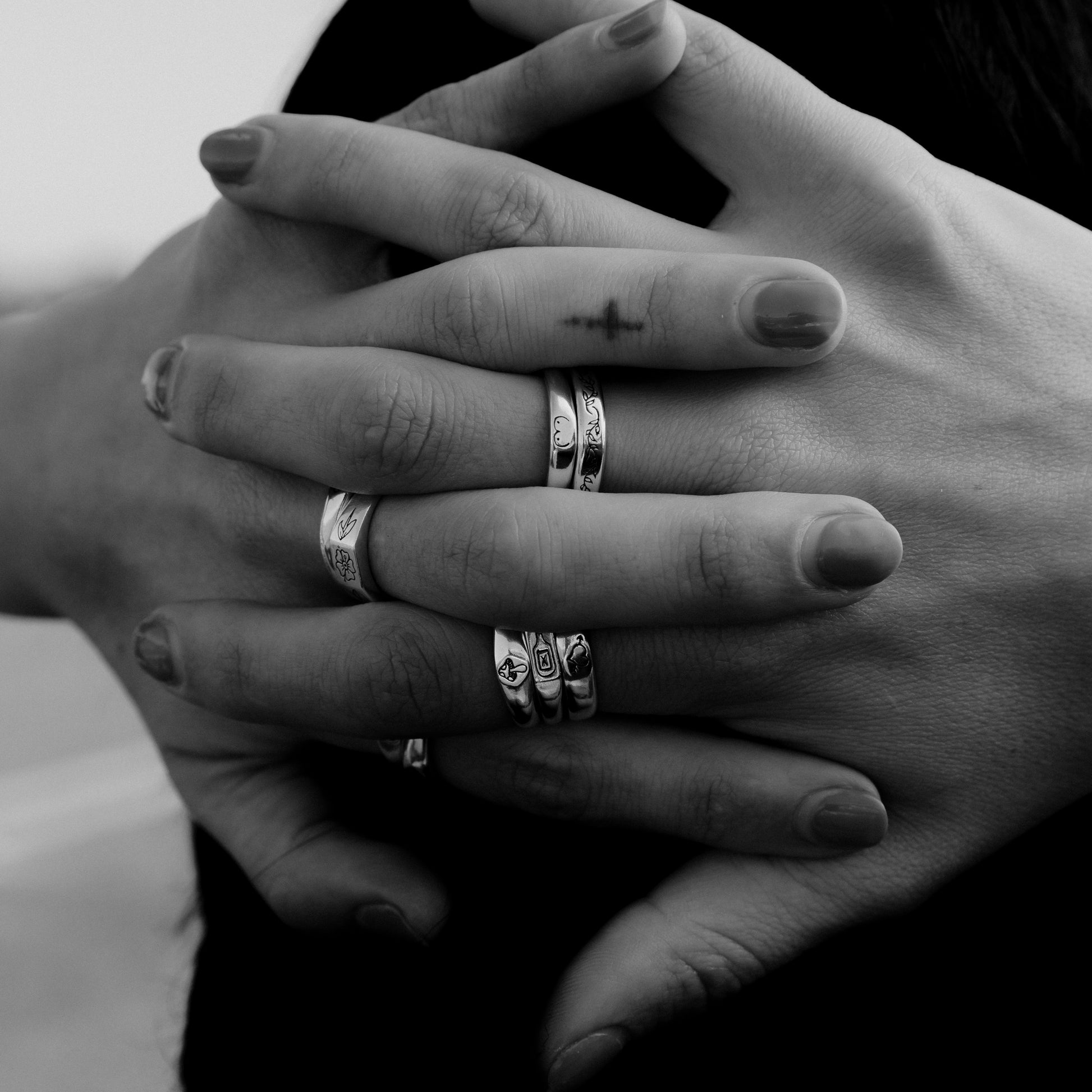 Inspired by Stick N' Poke tattoo designs the Mushy stacker ring is hand carved by us in wax and created using the "lost wax method" in sterling silver ring with oxidised, tumble and hand polish finish.