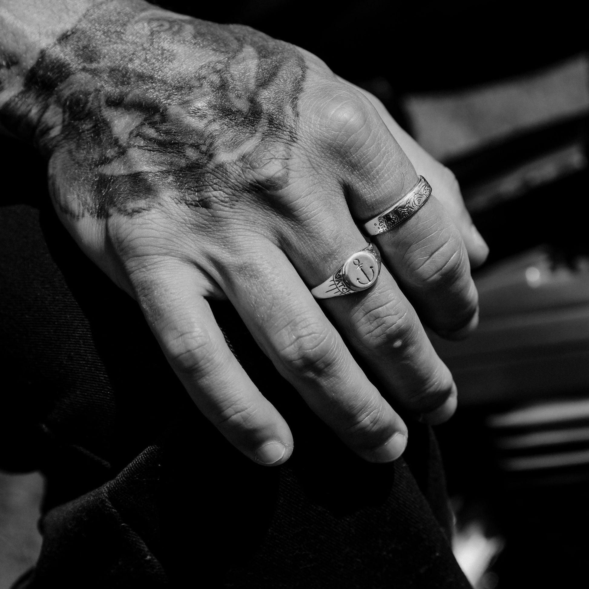 Band design the ring is hand carved in wax and created using the "lost wax method" in Solid 9ct. Yellow Gold ring with oxidised, tumble and hand polish finish.