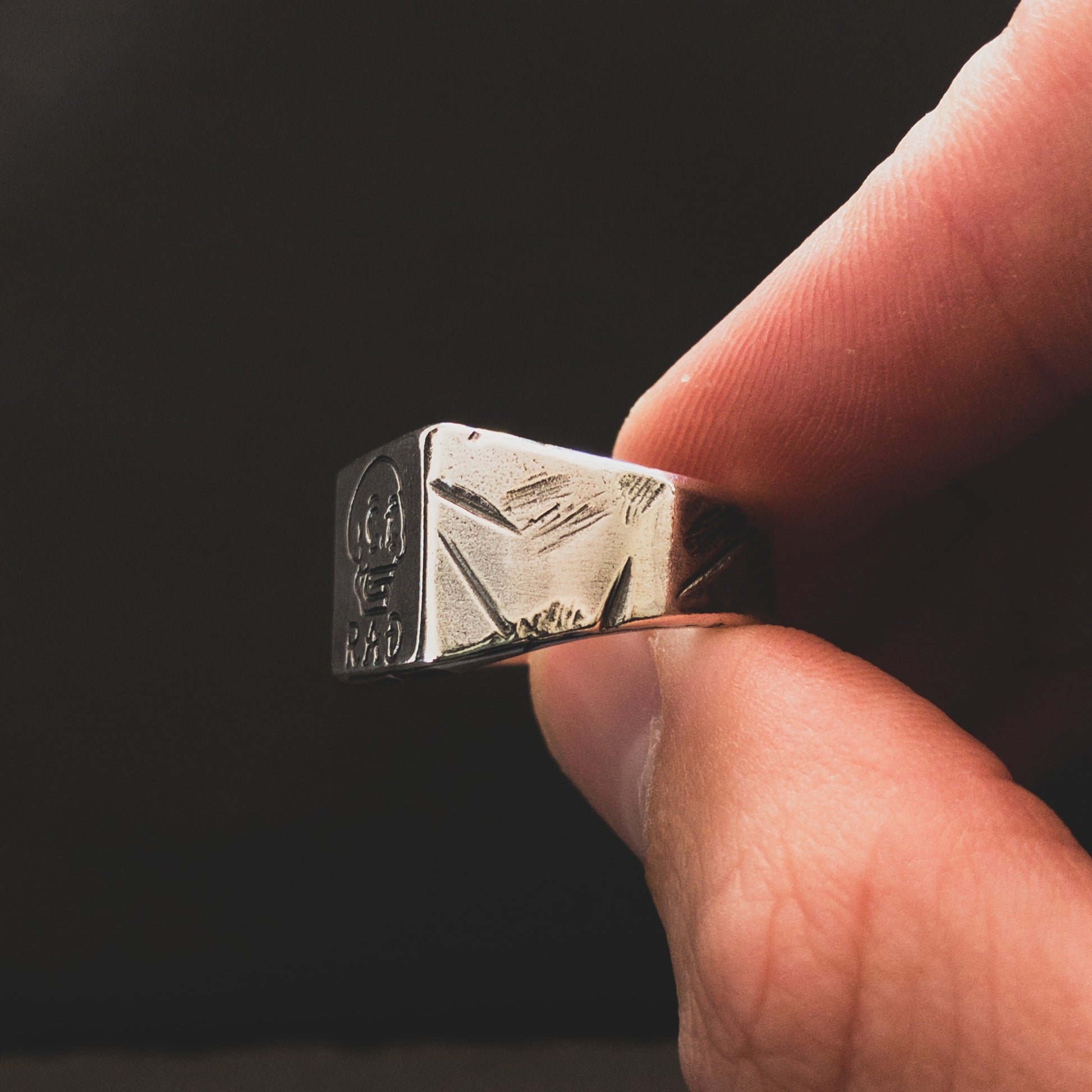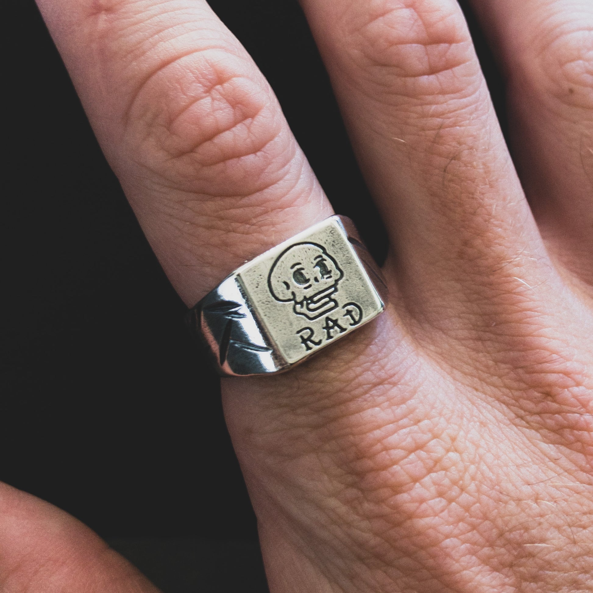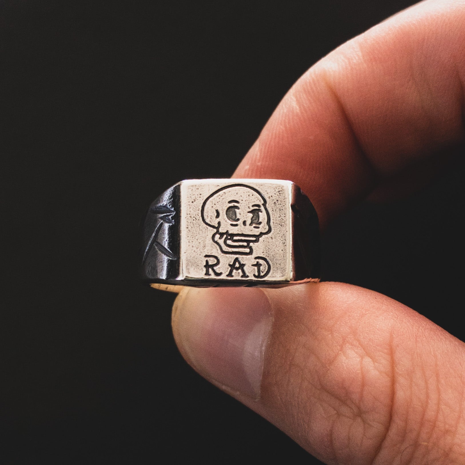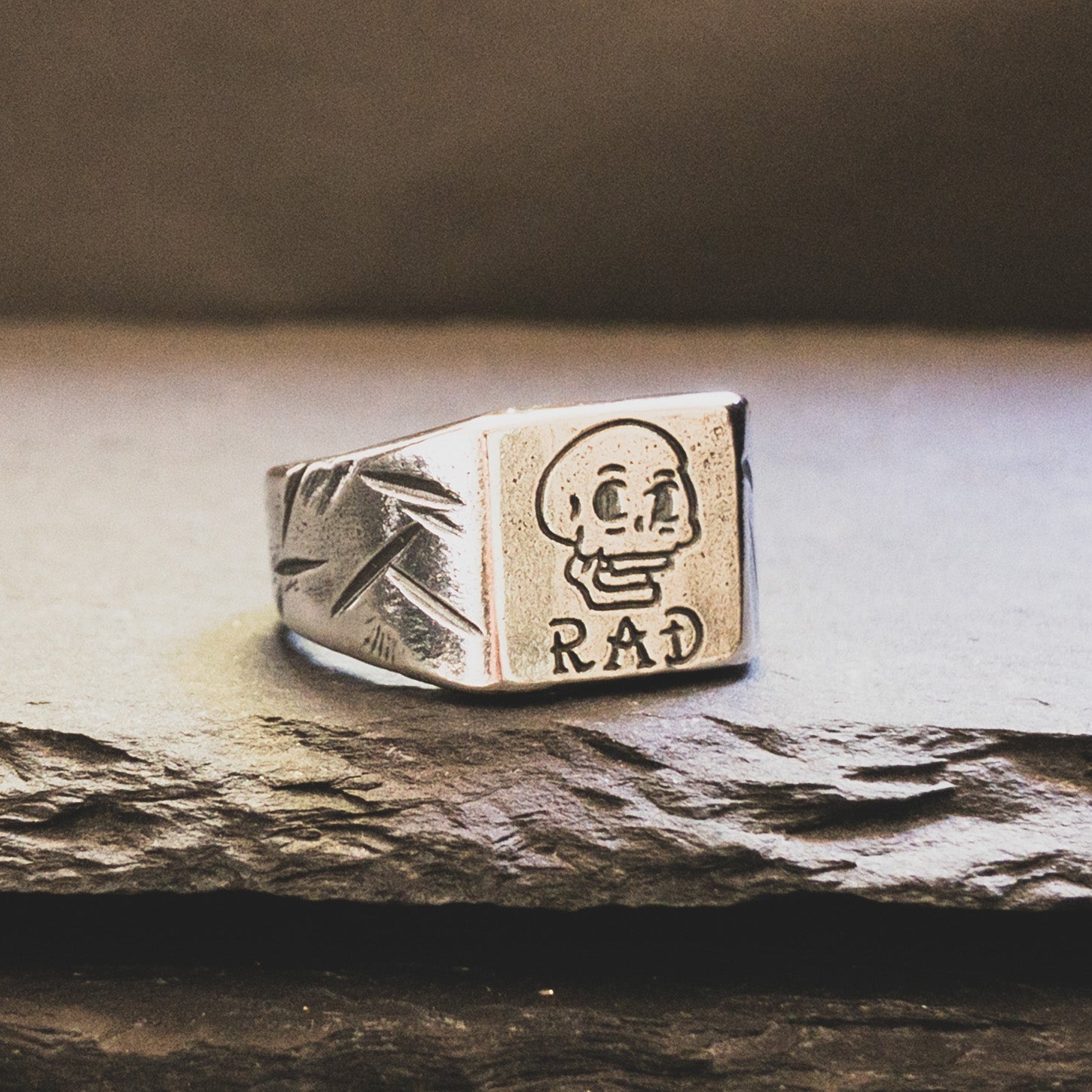"RAD" is made in 925 sterling silver a square face signet ring. The ring features Jakes signature skull with RAD engraved underneath displaying a rough oxidised finish on the entire ring.
