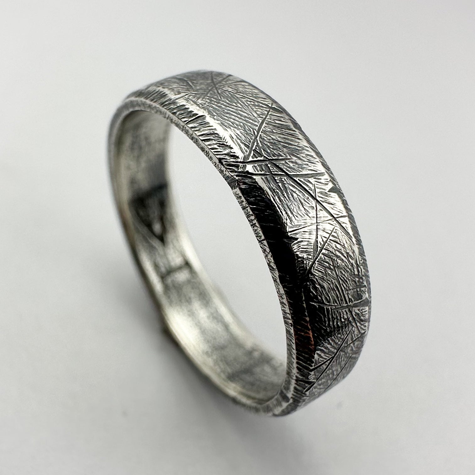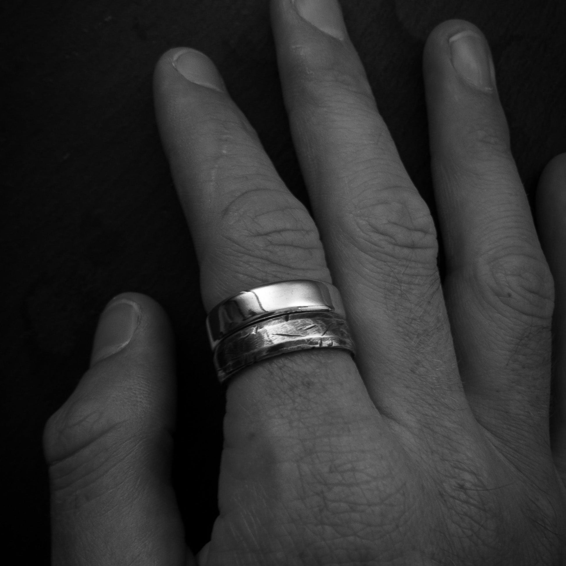 Each frayed band is hand textured meaning there are no two rings with the same markings whish is embraced for each rings individuality.